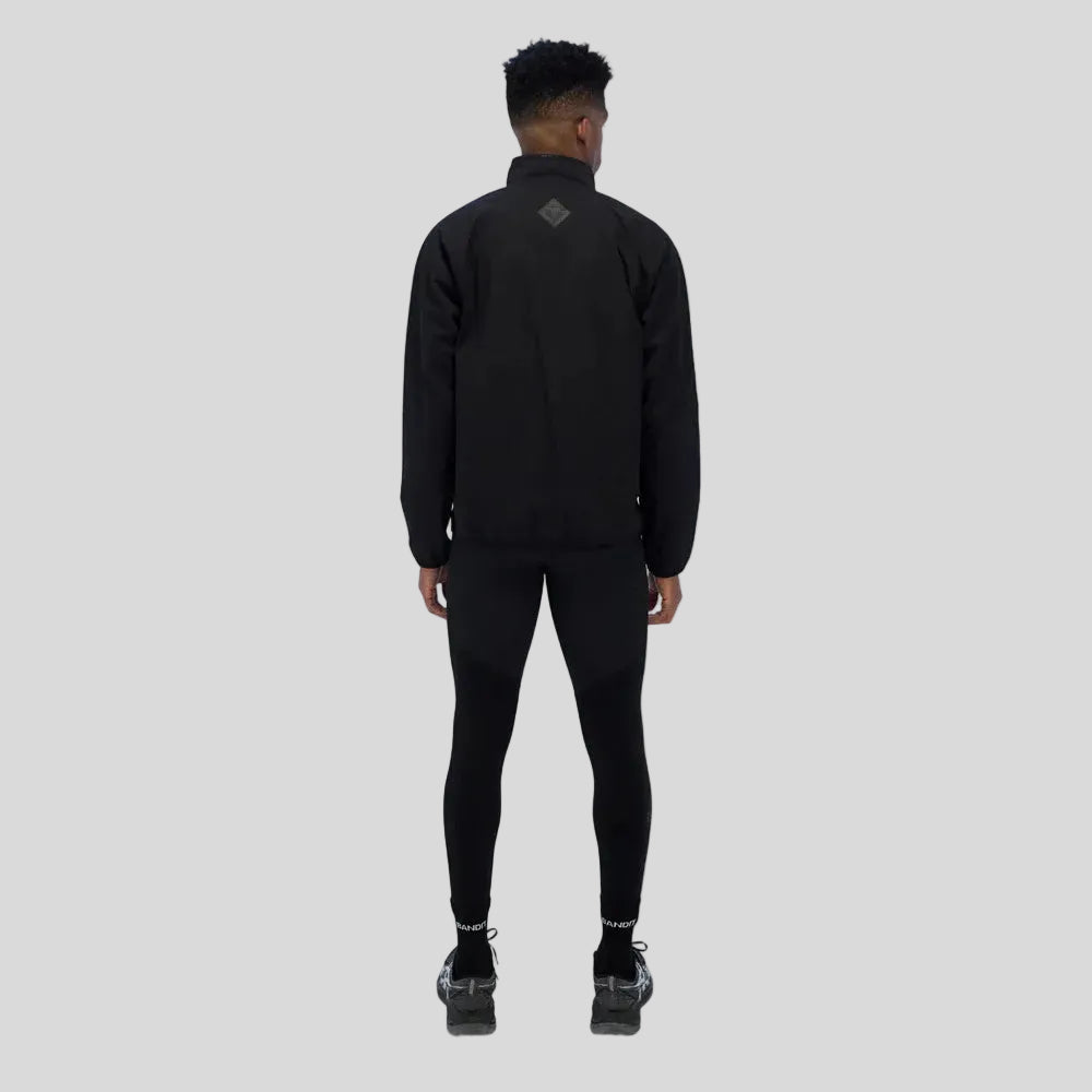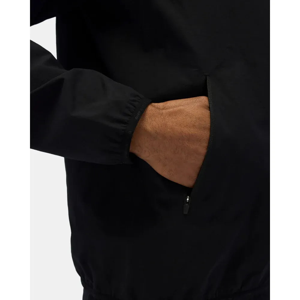 Details include asymmetric zipper entry at wearer’s left raglan seam, branded elastic binding at the mock neckline, hem, and sleeve opening Pocketing system includes two front zipper pockets. The Japanese stretch woven is bonded internally with brushed grid heat mapped details to add warmth without compromising breathability.