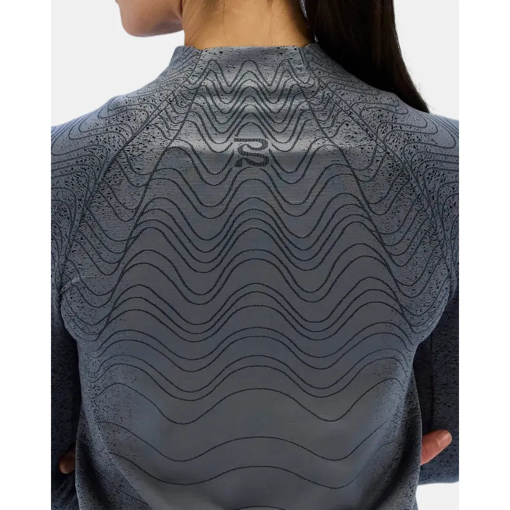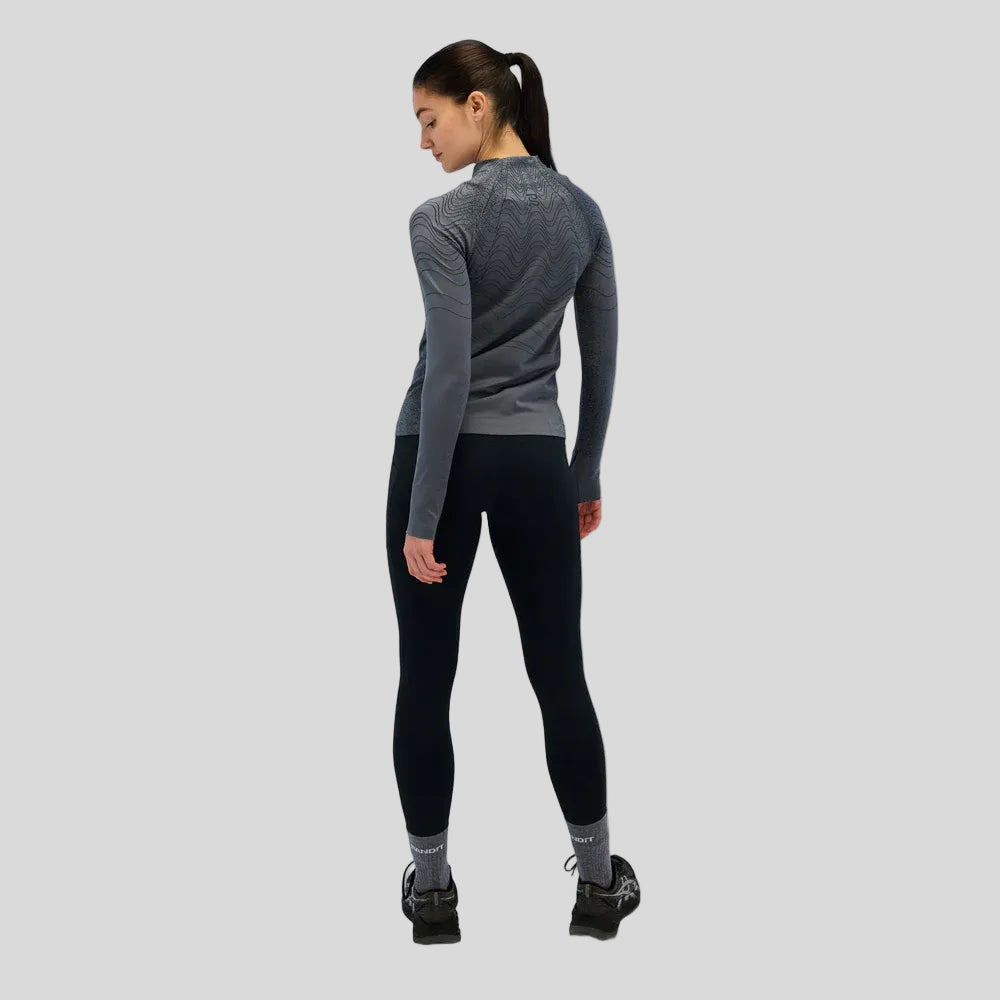 This seamless silhouette is knitted with yarns that create a durable yet soft hand feel with moisture management and quick dry capabilities. Additionally, the carbon fiber knitted throughout helps to regulate the body temperature, while also having anti-static and anti-microbial properties.
